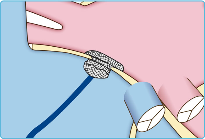 カテーテルといわれる細い管を使用して、大腿静脈から心臓にアプローチし、iASDを閉鎖する低侵襲治療です。用いるデバイスは、留置すると円盤状になるもので、これで右心房側と左心房側の双方から挟み込むようにしてiASDをカバーして塞ぎます。