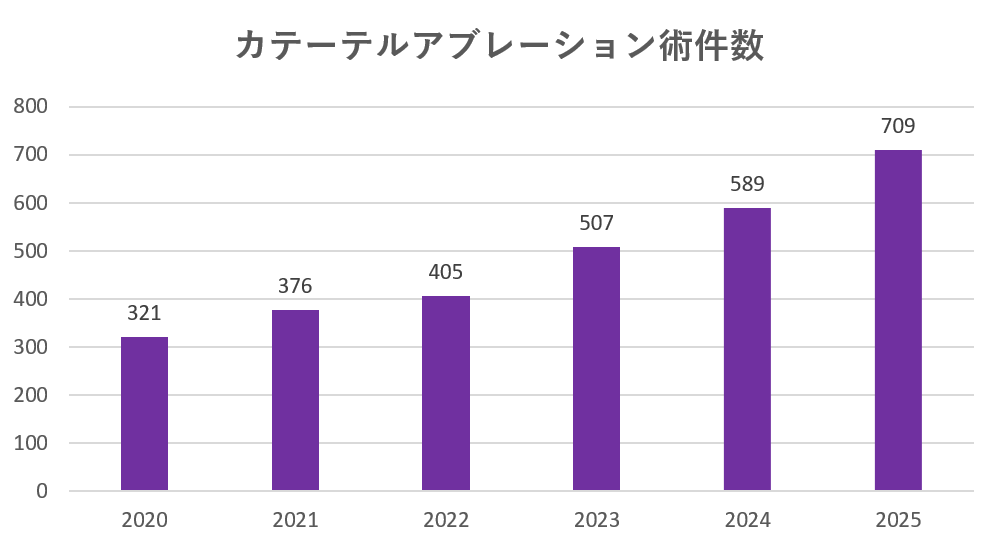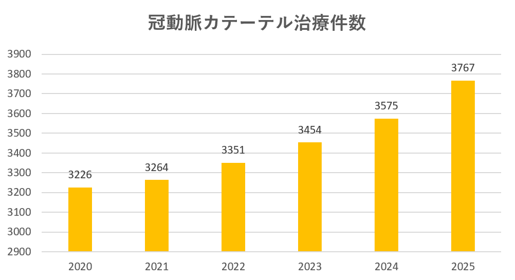 コロナ禍の時期を含め、PCI(冠動脈カテーテル)件数は年々増加しており、2025年は3,767件と過去最高となりました。また、佐藤明アブレーションセンター長の着任を受け、カテーテルアブレーション治療数も着実な増加を記録しました。