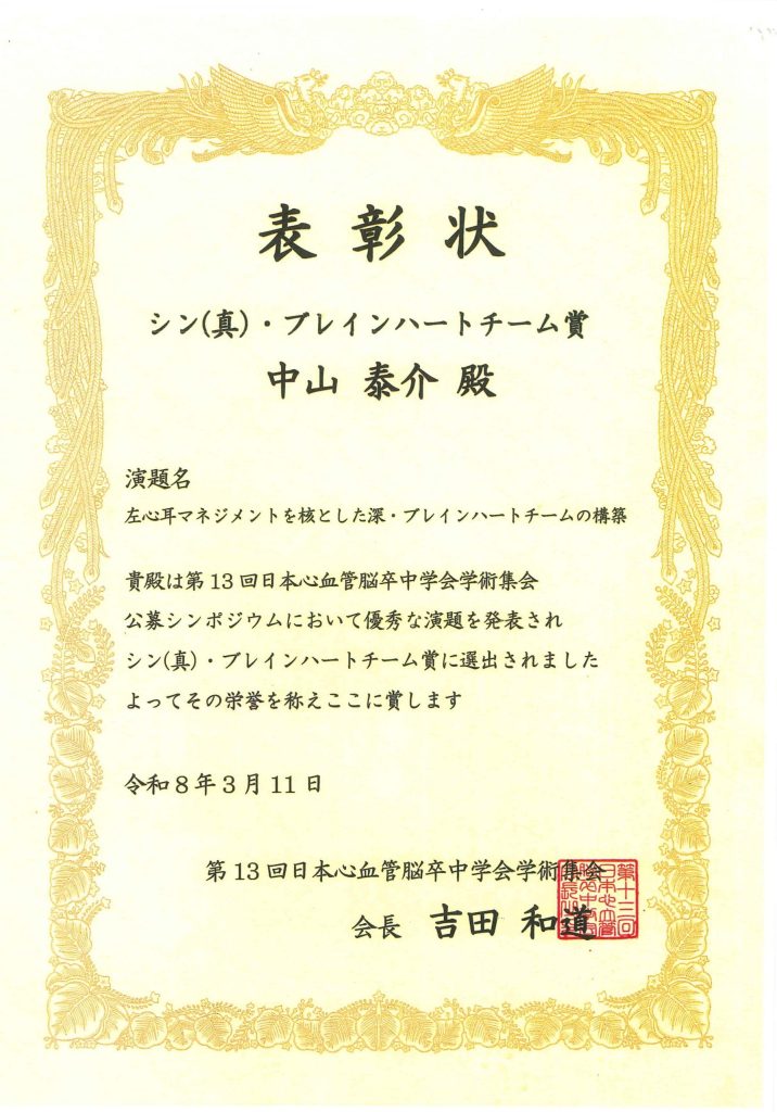 第13回日本心血管脳卒中学会学術集会(CVSS)にて中山泰介医師の発表がシン(真)・ブレインハートチーム賞に選出されました。