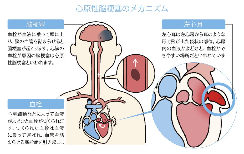心原性脳梗塞の原因の約9割がこの左心耳でつくられた血栓だといわれています。大きな血栓によって引き起こされる脳梗塞はノックアウト型の脳梗塞と呼ばれ、半身不随や寝たきりになるケースが少なくありません。