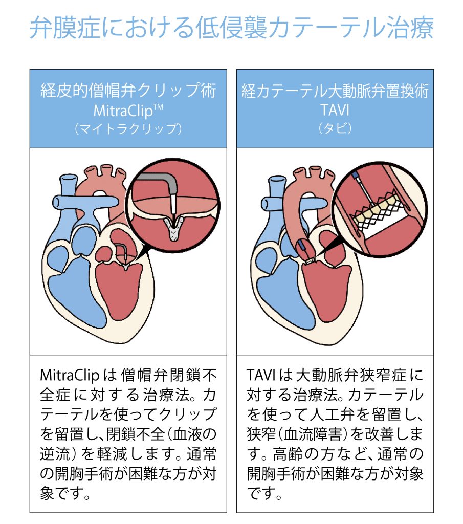 一方、80歳以上の患者様や他の病気をお持ちの方などは開胸手術が難しくなってくるため、大動脈弁狭窄症の場合は「経カテーテル大動脈弁置換術(TAVI)」、僧帽弁閉鎖不全の場合は「経皮的僧帽弁クリップ術(MitraClipTM)」を検討します。こちらはいずれも胸を開かず、心臓が動いている状態でカテーテルを使って行うため、体への負担をぐっと抑えられる治療法です。