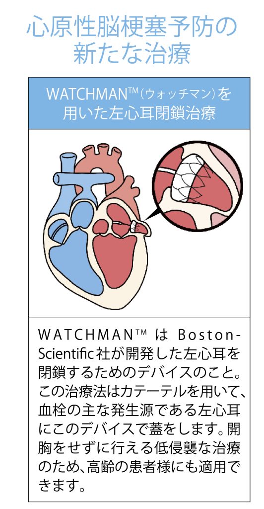 そこで考えられるのが血栓を生み出す左心耳の切除や閉鎖手術です。ただ、これらの手術は開胸を伴うため負担が大きく、これまで高齢の患者様の手術は困難でした。そこで登場したのがWATCHMANTM(ウォッチマン)を用いた左心耳閉鎖治療です。この治療はカテーテルを用いて血栓の主な発生源である左心耳にデバイスで蓋をするというもの。最大の特徴はTAVIやMitraClipTMのように、開胸をせずに行えることです。血栓の高い抑制効果がありながら低侵襲であるため、高齢の患者様にも適用できる治療法です。