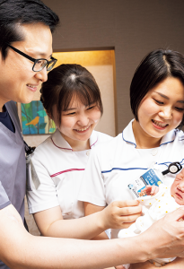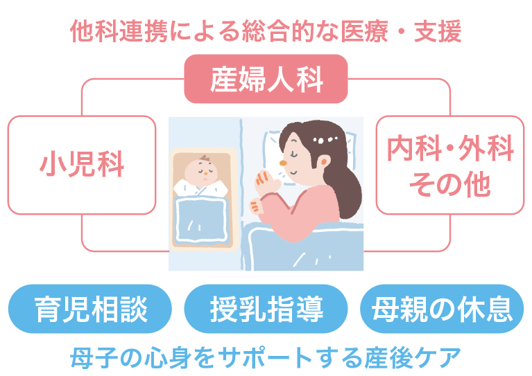 総合病院のメリットを活かし、小児科と連携し安心してお産ができる環境を整えています。新生児の疾患のほか、慢性疾患のある妊婦さんや妊娠中に発症した合併症についても他診療科と連携により対応可能です。