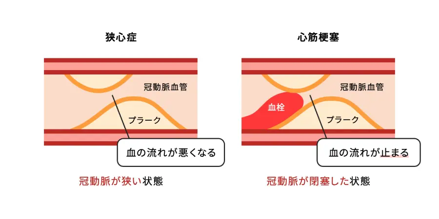 同じ胸の痛みを伴う病気に狭心症がありますが、心筋梗塞とは明確な違いがあります。狭心症は、血管が「狭く」なり血流が一時的に悪くなる状態で、痛みはしばらくすると治まります。一方、心筋梗塞は血管が「完全に詰まり」心筋が壊死するため、痛みは30分以上継続し、早急に血流を再開させないと詰まった個所から先の心筋は壊死します。