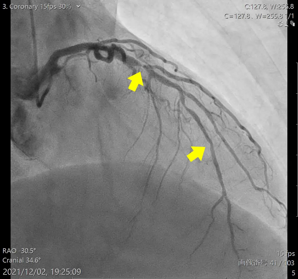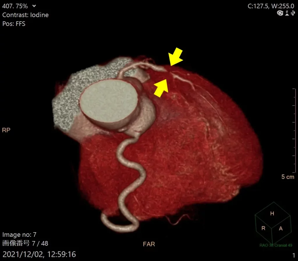 狭心症(きょうしんしょう)は、心臓に酸素や栄養を供給している血管「冠動脈(かんどうみゃく)」の血流が悪くなることで、胸の痛みや圧迫感などが起こる病気のこと。主要な冠動脈として右冠動脈(RCA)、左前下行枝(LAD)、左回旋枝(LCX)の3本があります。