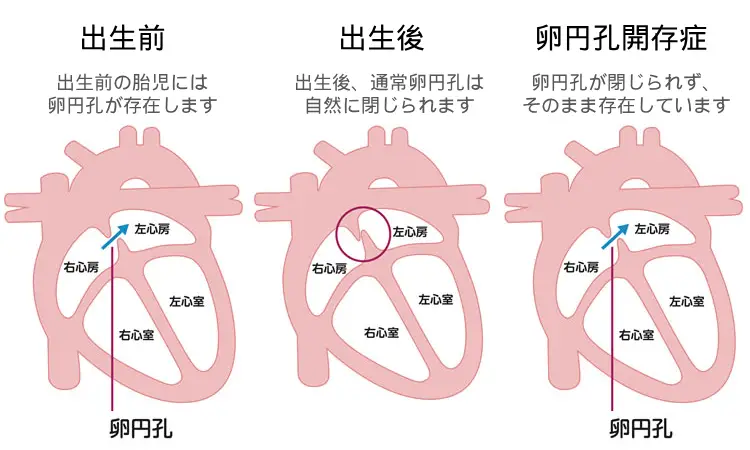 卵円孔は出生前の胎児全員にあるもので、通常は出生後に自然に閉じますが、一部の方ではこれが閉じないまま残ることがあります。成人の約20〜25%に存在すると言われ、ほとんどの場合無症状で治療も不要です。気が付かないまま一生を終える方も多数います。