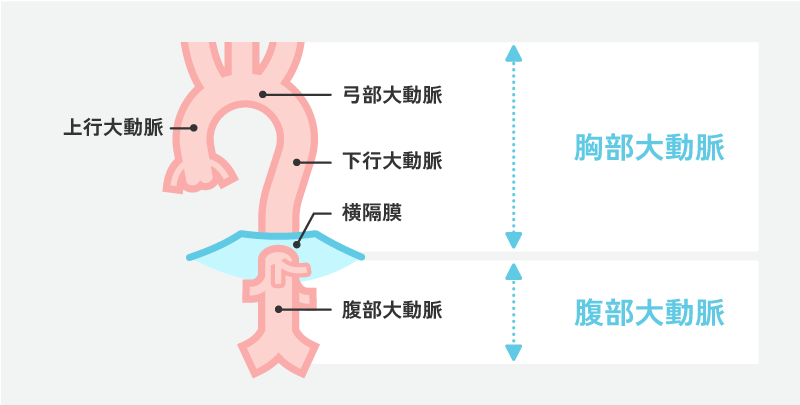 大動脈とは全身へ栄養を送る動脈の中で、心臓に近い根元の部分にあたる一番太い動脈で、上に向かう上行大動脈、弓のように曲がる弓部大動脈、そして下に向かう下行大動脈の3つの主要な部分に分けられます。この下行大動脈はさらに、横隔膜より上の胸部大動脈と、それより下の腹部大動脈(胸腹部大動脈)に分類されます。
