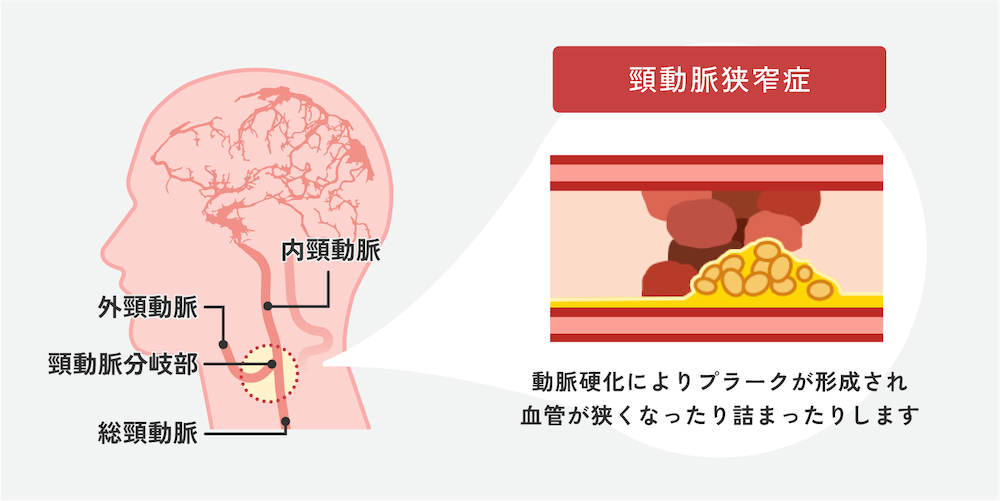 心臓から来る頸動脈は首の辺りで脳へ向かう内頸動脈と顔面や頭皮などに向かう外頸動脈に分かれますが、この分岐部分が狭窄が良く起きる部位として知られています。