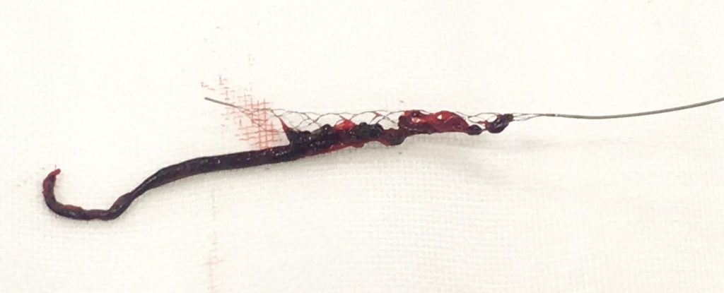 脳内の太い血管がつまる症例などでは、血栓溶解療法(rt-PA)は十分な結果が得られないことも多く、そうした場合に行われるのが血栓回収治療です。カテーテルと呼ばれる細い管を血管内に挿入し、血栓がつまっている箇所まで運びます。その後に、カテーテルを通じて治療機器を操作し、血栓を絡めとる、もしくは吸引して回収します。