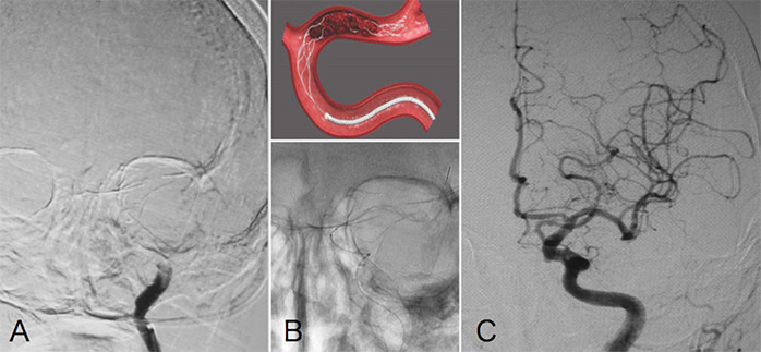 A.治療前の脳血管撮影所見 B.ステントにて血栓を捕捉、牽引中 C.治療後の脳血管撮影による再開通所見