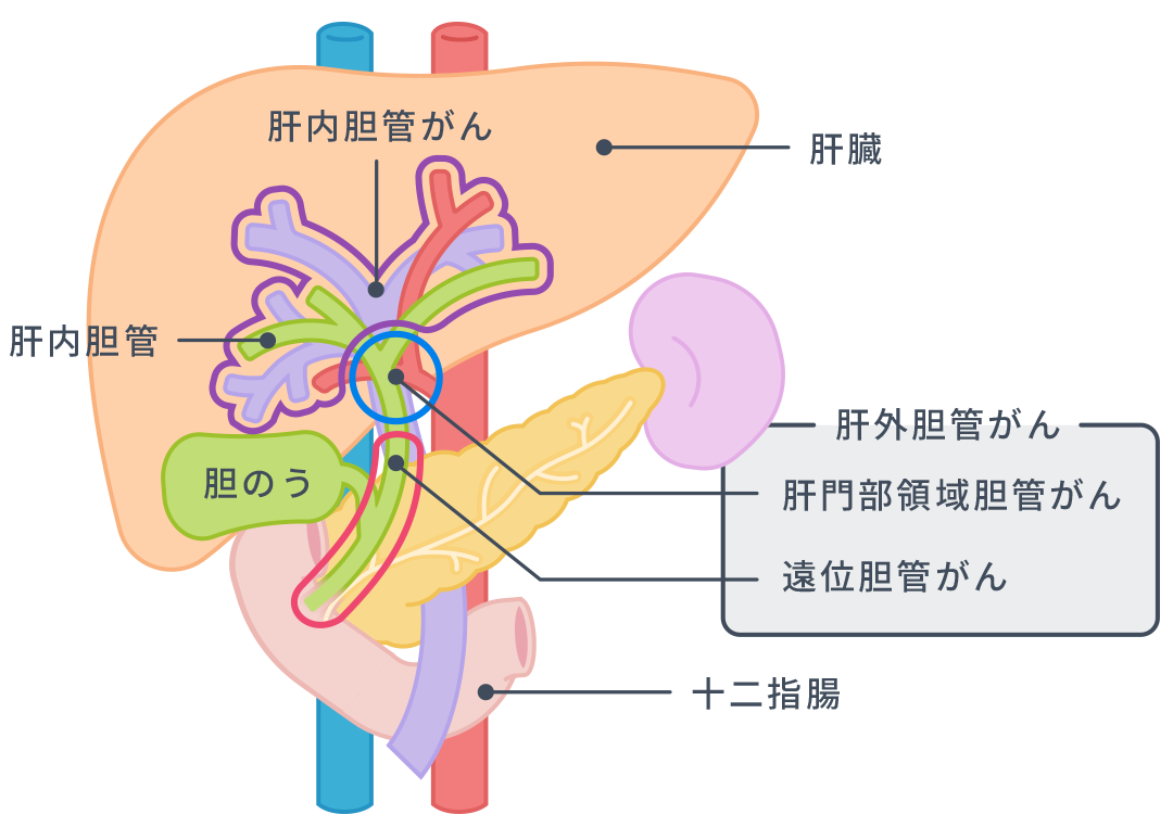 胆管がん(たんかんがん)とは肝臓で作られた胆汁を十二指腸まで運ぶ管である胆管に発生するがんの呼称です。発生した部位により分類が異なり、肝臓内に発生した場合は肝内胆管がん、肝臓外の肝外胆管がんと分類されます。さらに肝外胆管がんは、より肝臓に近い部位に発生する肝門部領域胆管がんと十二指腸側に発生する遠位胆管がんに分類されます。