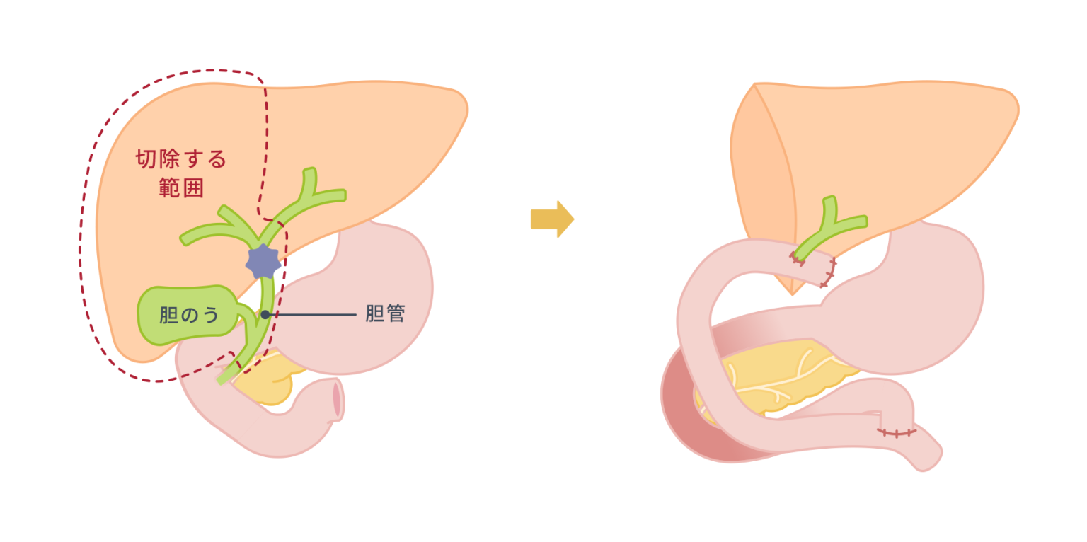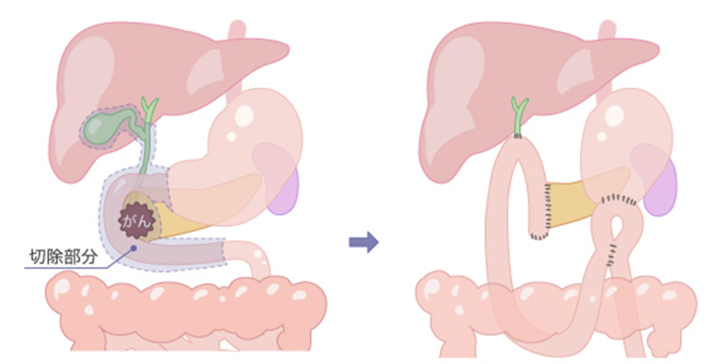 がんのある部位を切除して再建する手術です。肝内胆管がんと肝門部領域胆管がんでは肝臓を含めて切除を行います。遠位胆管がんでは膵頭十二指腸切除術が標準的な手術となります。がんの部位や進行度、周囲の臓器への浸潤があるかなどにより、様々な術式が用いられますが、がんの根治(がんをとりきる)を前提としたうえで、なるべく患者様の身体に負担が軽い手術が行われます。