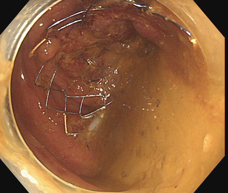 大腸がんが進行し腸が詰まってしまう閉塞性大腸がん(大腸がん腸閉塞)に対する治療です。従来は人工肛門を造設して対処していましたが、人工肛門はケアの負担やにおいに対する不安などからQOL(生活の質)低下が避けられません。そのため当院ではステントと言われるメッシュ構造の金属製の網を用いて詰まりを解消し、人工肛門を回避する治療を行っています。大腸ステント治療は緩和治療を目的に行う場合と根治手術前に全身状態の回復を目的として行う場合があります。
