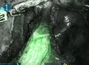 当院ではICG(インドシアニングリーン)と呼ばれる特殊な薬剤を使用する手術を実施しています。ICGは血液中のタンパク質と結合する性質があり、特別なカメラを通して見ると緑色に光ります。肉眼では見えにくい情報を可視化することで、より正確に腫瘍やリンパ節の位置または範囲を確認し、精緻で確実な手術を実施しています。これにより合併症リスクの低減や、一層の低侵襲化を図っています。