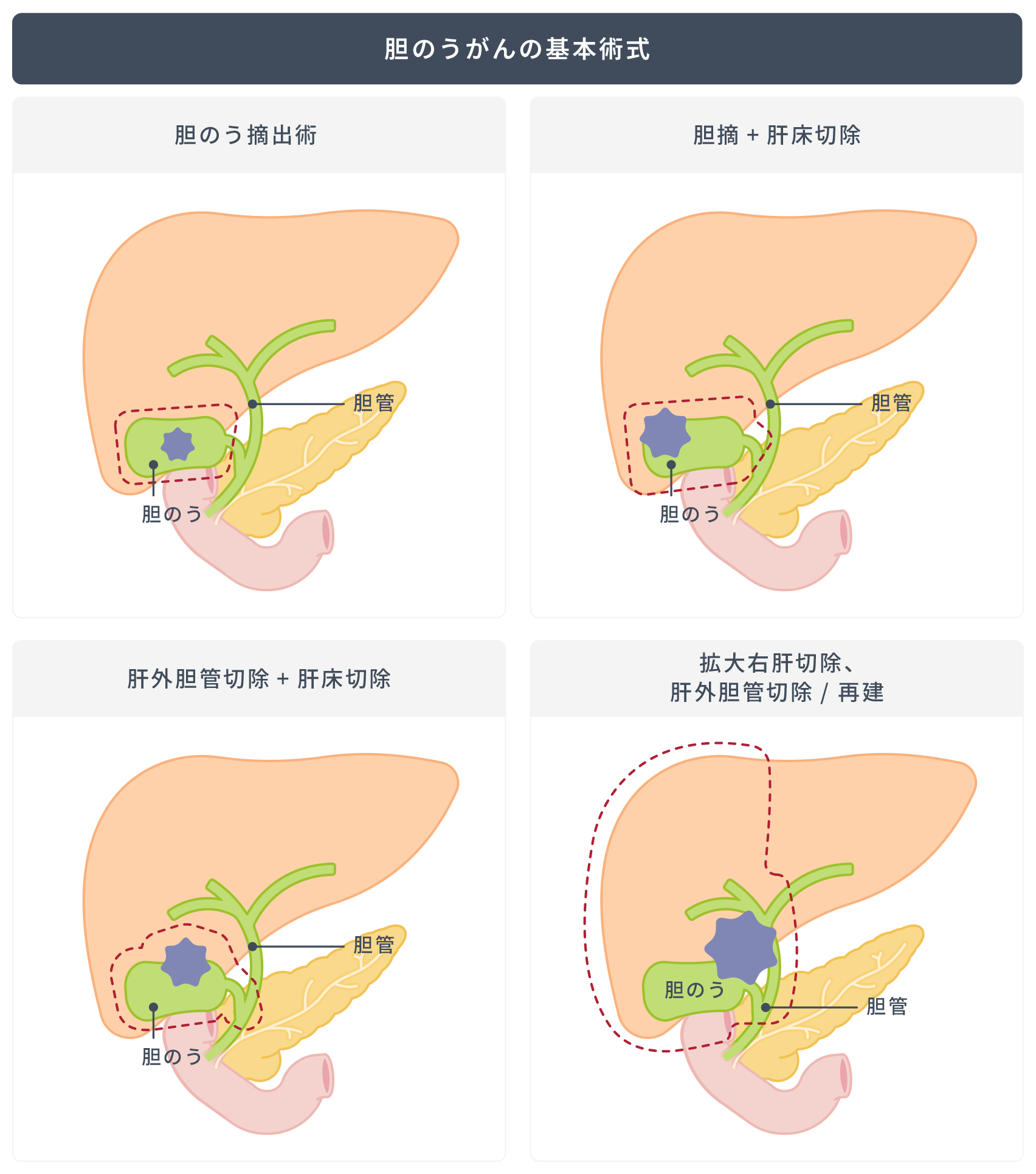 がんの切除が可能な場合は外科手術となります。さらに手術が難しい場合は化学療法(抗がん剤治療)や放射線治療を実施する場合があります。また痛みや症状の緩和を目的とした胆道ドレナージを行う場合もあります。