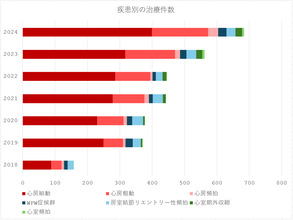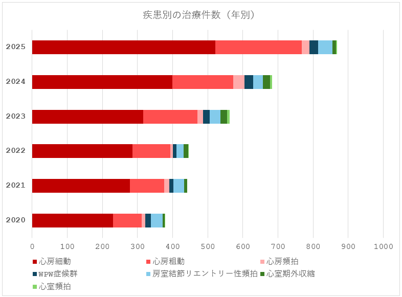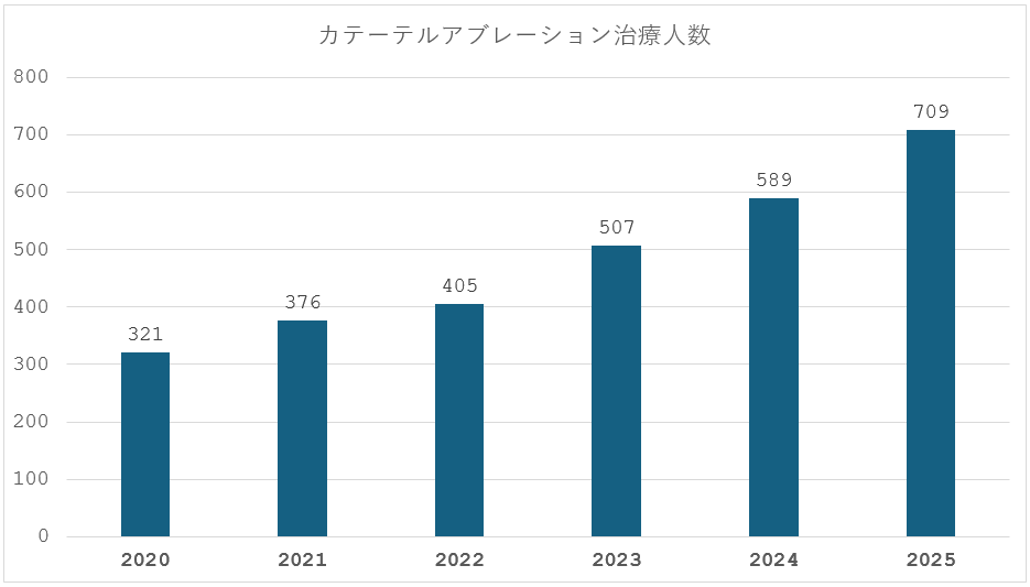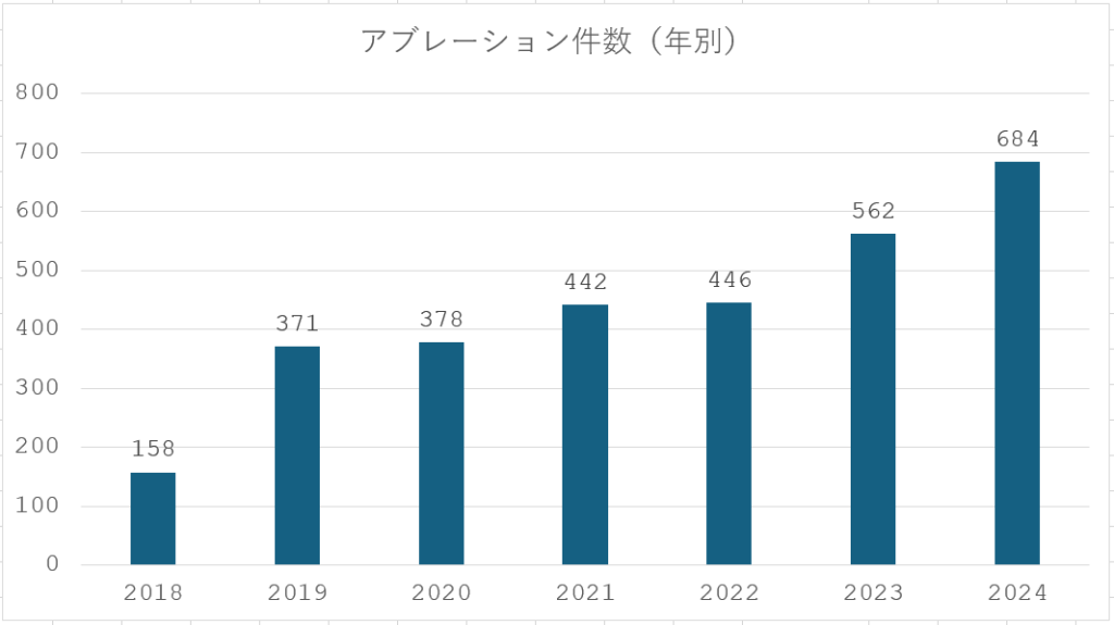 当院のカテーテルアブレーション術施術件数はコロナ禍の時期も含めて年々増加しています。2025年は8月末時点ですでに550件を超える件数を実施しています。豊富な治療実績は、確かな習熟と合併症の減少に繋がります。当センターではスタッフ一同が意気軒昂と質の高い医療を提供しています。